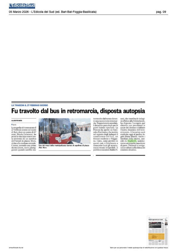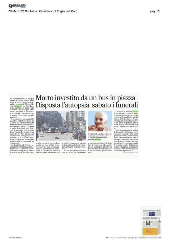 Sarà conferito domani, giovedì 5 marzo 2026 alle ore 9, presso la Procura della Repubblica di Bari, l’incarico per l’autopsia sul corpo di Nicola Colaianni, il sessantaseienne – che tra meno di un mese avrebbe compiuto 67 anni – tragicamente deceduto dopo essere stato investito da un autobus dell’Amtab mentre si trovava in piazza Aldo Moro, davanti alla stazione centrale.