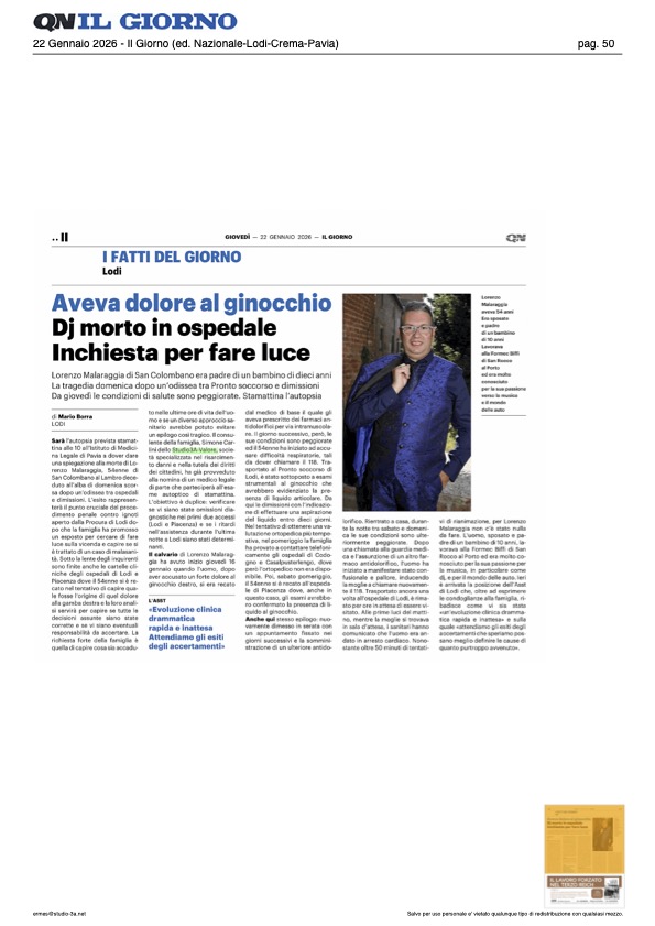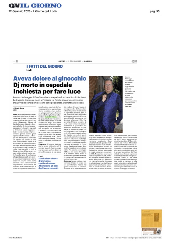La famiglia di Lorenzo Malaraggia, scossa dal tragico evento, si è affidata, tramite il consulente personale per la Liguria e la Lombardia dott. Simone Carlini, a Studio3A-Valore S.p.A., società specializzata a livello nazionale nel risarcimento danni e nella tutela dei diritti dei cittadini, per accertare se vi siano state omissioni, ritardi o responsabilità nella gestione clinica e assistenziale. Sulla vicenda la Procura della Repubblica presso il Tribunale di Lodi ha aperto un procedimento penale contro ignoti. Il fascicolo è seguito dal Sostituto Procuratore dott.ssa Antonella Dipinto. L’autopsia è stata disposta per domani, 22 gennaio 2026, alle ore 10, presso l’Istituto di Medicina Legale di Pavia. L’esame sarà eseguito dal medico legale incaricato dalla Procura, dott. Chen Yao, e vedrà la partecipazione anche di un medico legale di parte, nominato da Studio3A-Valore S.p.A., il quale si interfaccerà poi con il dipartimento tecnico interno della società per valutare gli esiti degli accertamenti.