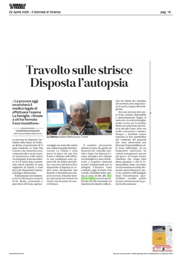 La Procura della Repubblica di Vicenza ha disposto l’autopsia sulla salma di Giuliano Bettio, il pensionato di 73 anni residente in viale San Lazzaro, a Vicenza, tragicamente deceduto dopo essere stato travolto da un’auto mentre attraversava sulle strisce pedonali.